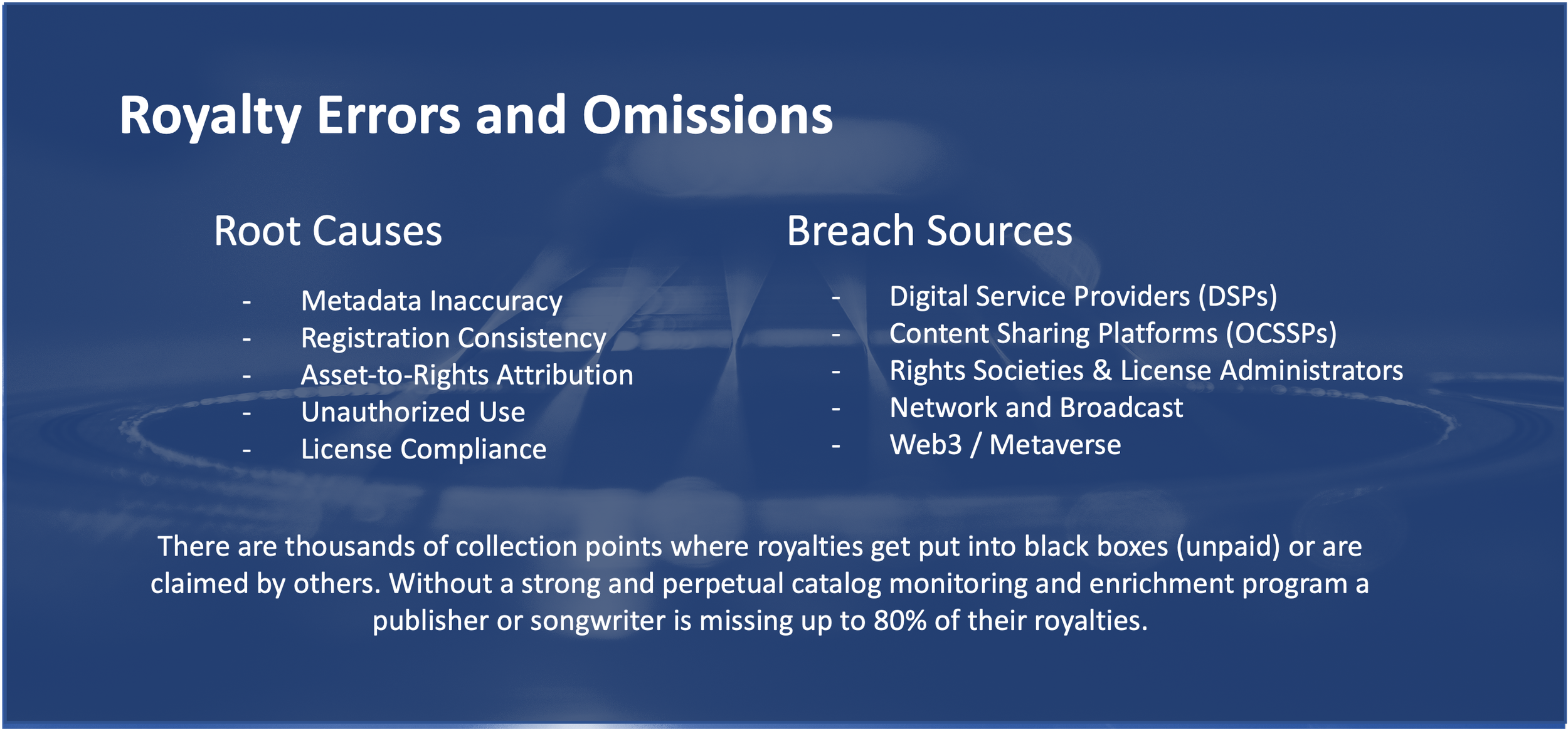 The result of these two problems is that in order for any artist, songwriter, label, or publisher to get paid for all distribution and uses of their music they must find that content themselves, hence 35% or more of music’s earned royalties go unpaid or paid to the wrong party.